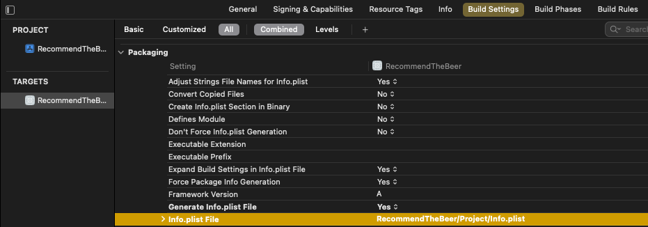 Build Settings내의 Info.plist파일 위치 설정 이렇게 해서 기본적인 세팅은 모두 끝났습니다.