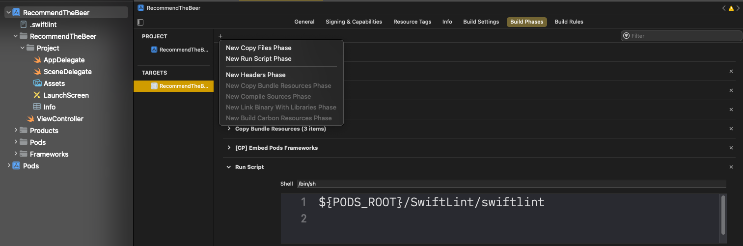 SwiftLint를 사용하기 위한 Script를 Build Phase에 추가 최상단 프로젝트 선택 -> Target 선택 -> Build Phases 탭 -> + 버튼을 눌러 New Run Script Phase 추가