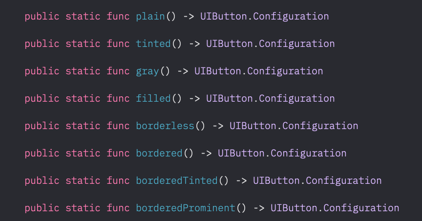 static으로 선언되어있는 style지정 메서드들 UIButton.Configuration에는 애플에서 사전에 만들어놓은 여러가지 스타일들이 있다.
