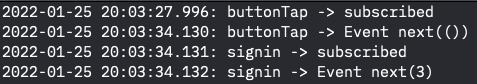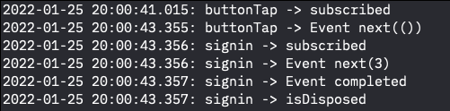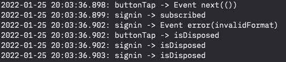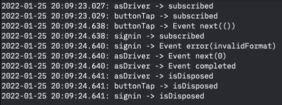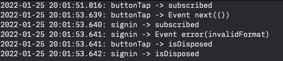 func bind() { let text = BehaviorRelay<String>(value: "") button.rx.tap.asObservable().debug("buttonTap") .withLatestFrom(textField.rx.text.orEmpty) .flatMap(Network.shared.signin) .filter { result -> Bool in switch result { case .failure(let error): self.errorManager.accept(error) return false case .success: return true } } .debug("asDriver") .map { return try String($0.get()) } .bind(to: text) .disposed(by: disposeBag) text.asDriver() .drive(label.rx.text) .disposed(by: disposeBag) }추가