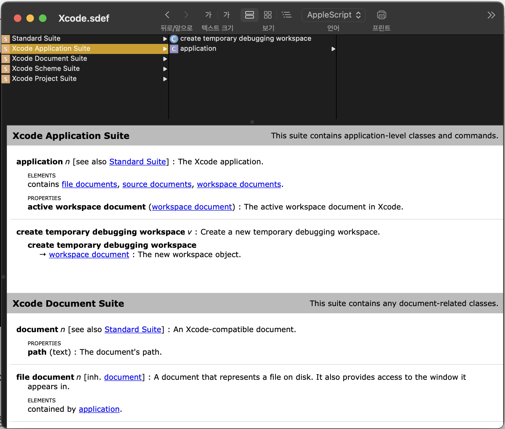Xcode의 applescript document 또한 각 application마다 document가 있어서 이를 보고 활용할 수 있다.