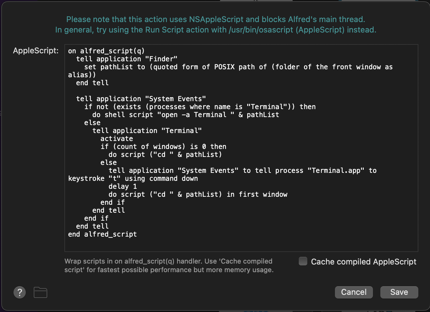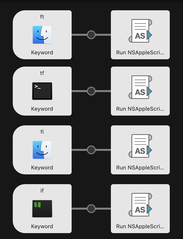 finder <-> terminal 현재 경로를 서로 변환해서 실행해주는 workflow 위와 같이 Applescript에 연결해서 mac application에 특화된 script도 작성할 수 있다.