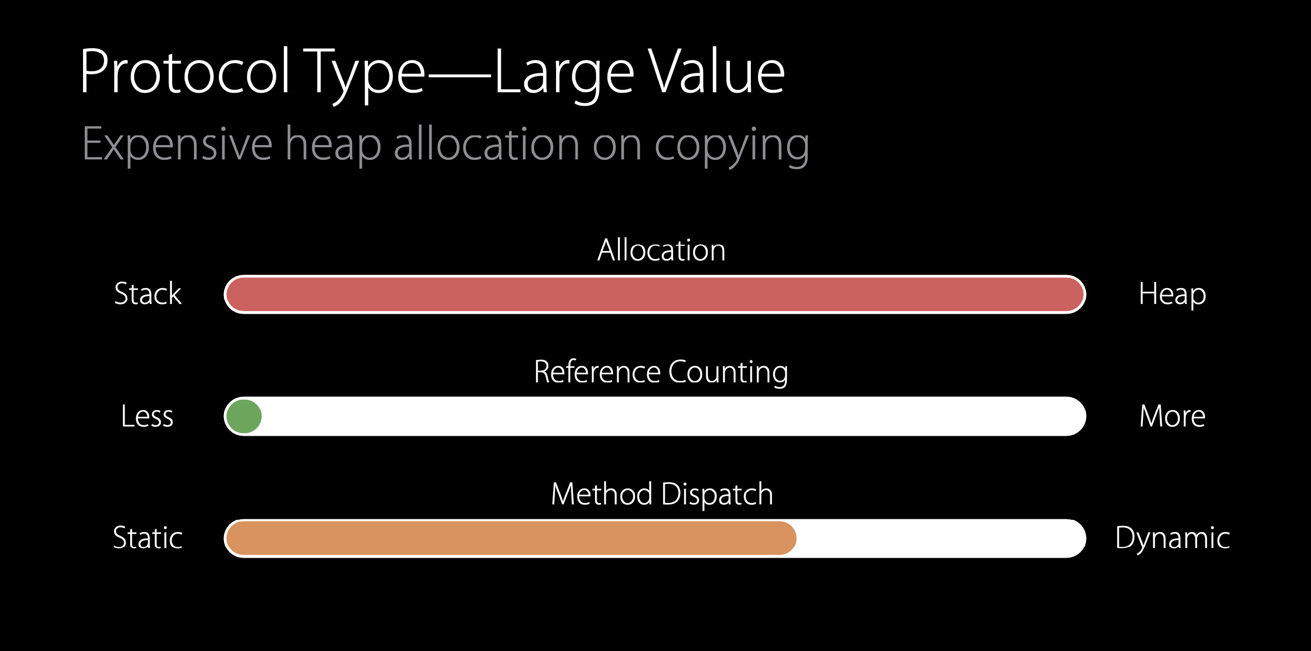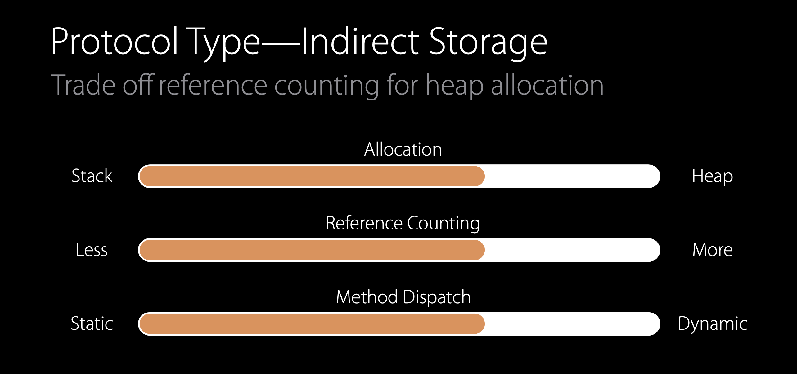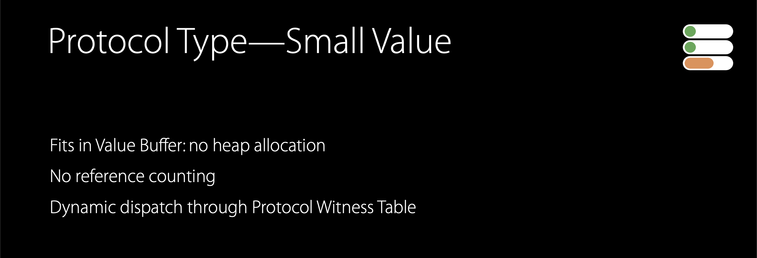작은 값을 가진 Protocol 타입은 stack에 저장되고, 생성된 객체에는 reference counting이 없어 비용이 매우 저렴합니다.