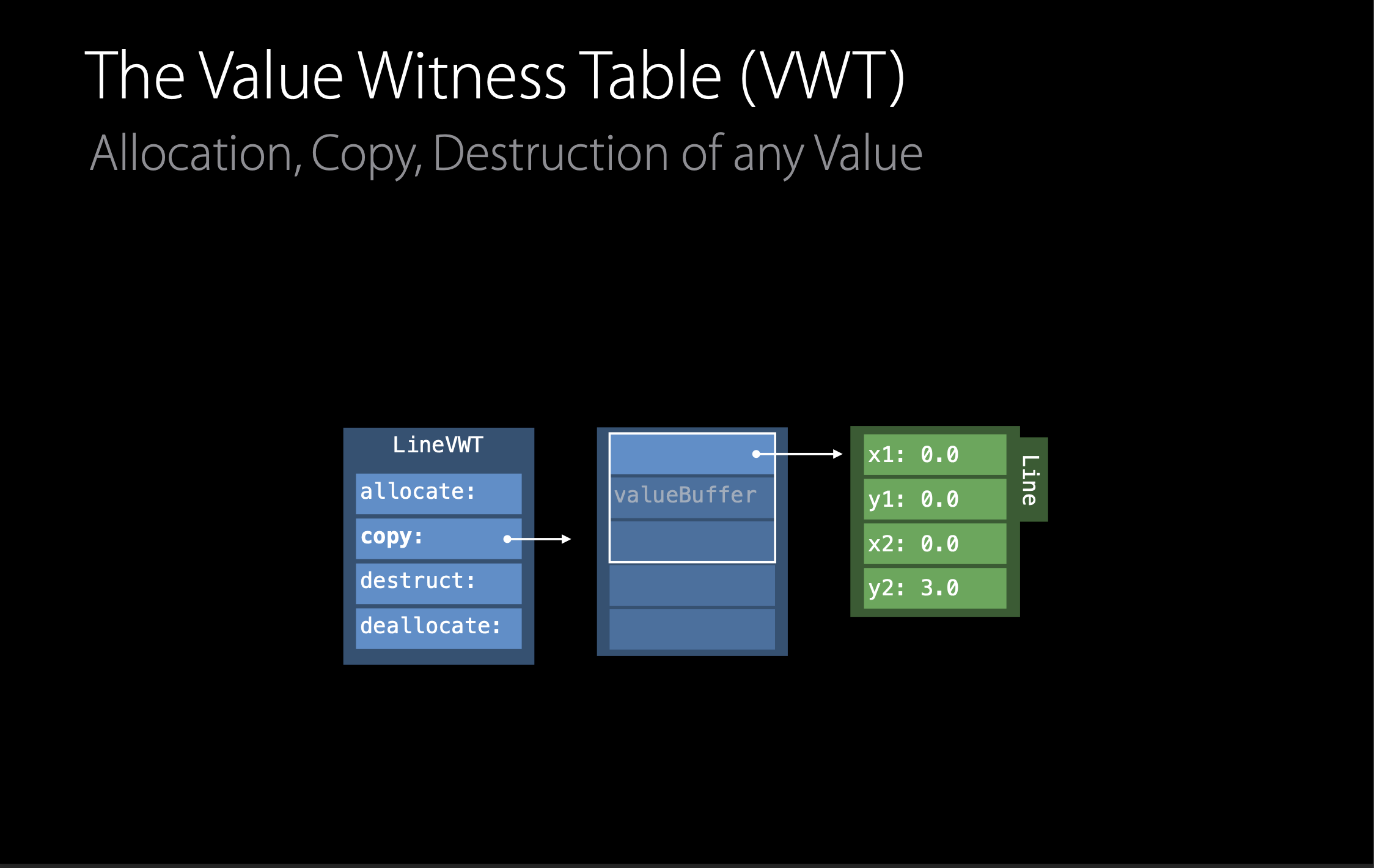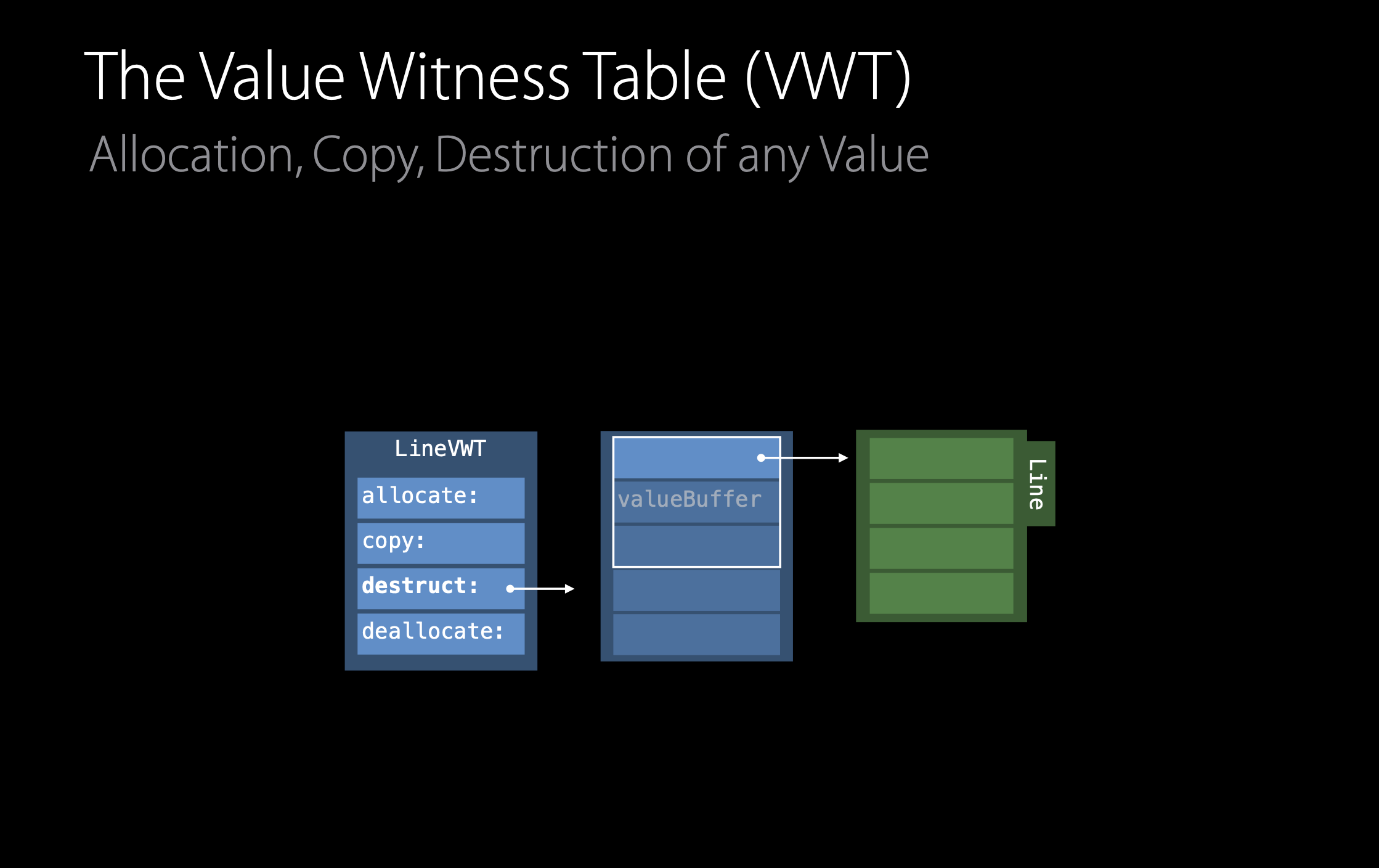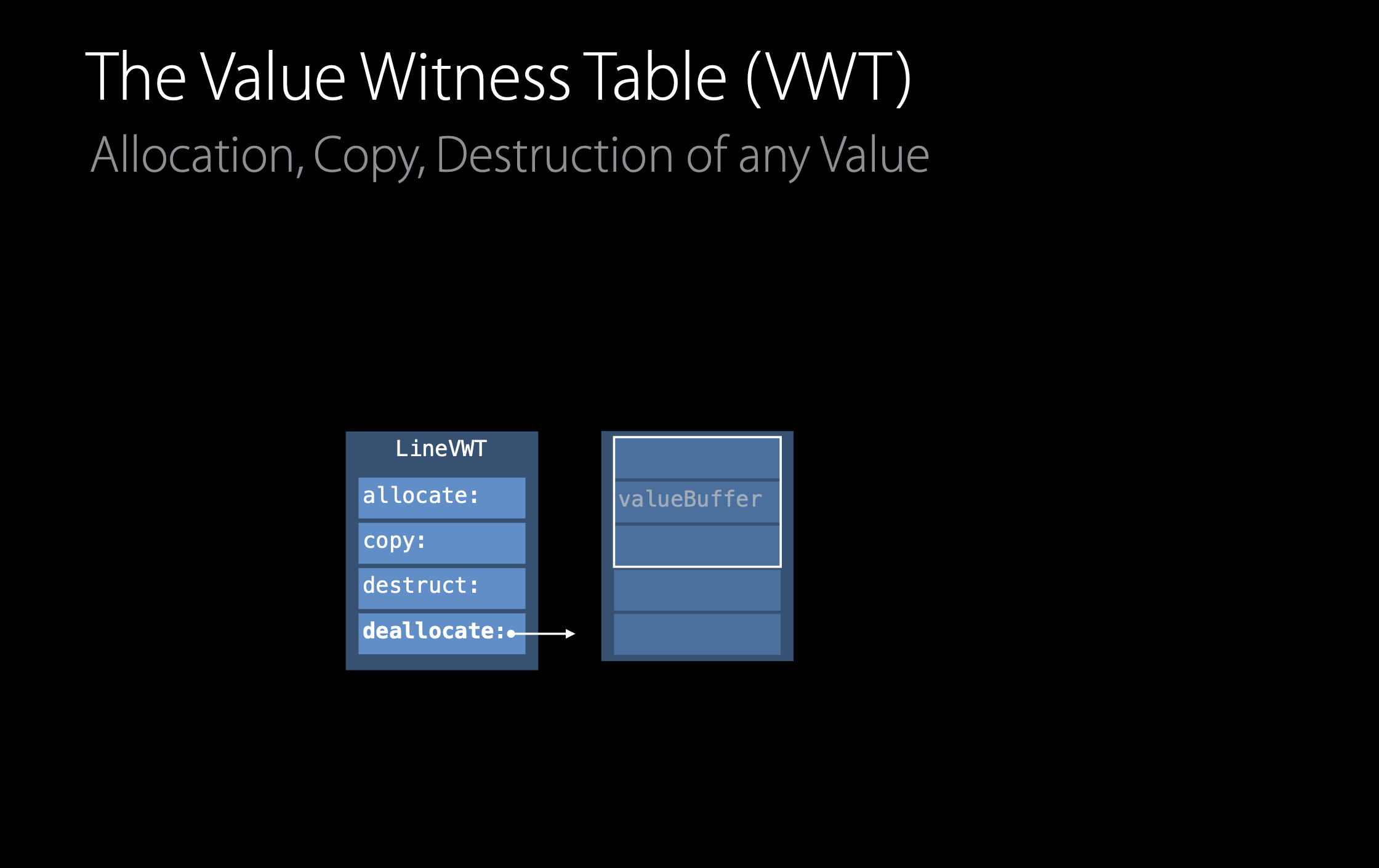 VWT는 value의 lifetime을 관리하고, 타입마다 해당 테이블이 존재합니다. ( 그럼 Line 객체가 두 개일 때에는 어떻게 할까 하는 의문이 들 수 있는데, existential container가 두 개 생기고, VWT는 하나만 생긴다고 생각하면 될 것 같습니다. )
