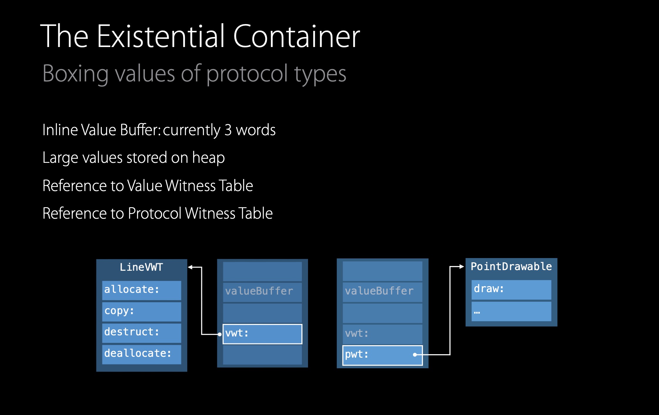 아래 그림은 두 개의 프레젠테이션을 합쳐서 만들었습니다. existential container란 보시다시피 5 word의 크기를 갖는 컨테이너입니다.