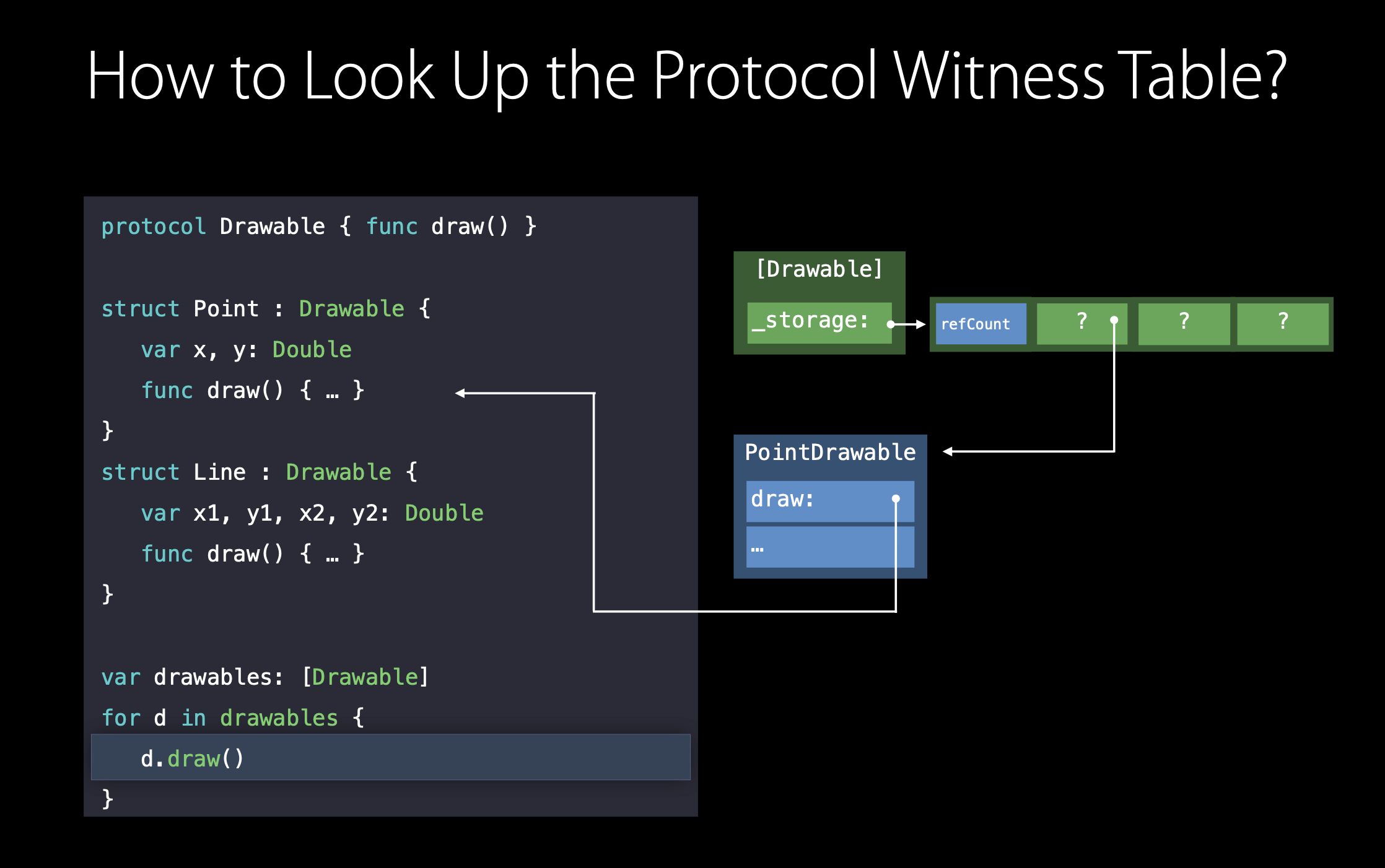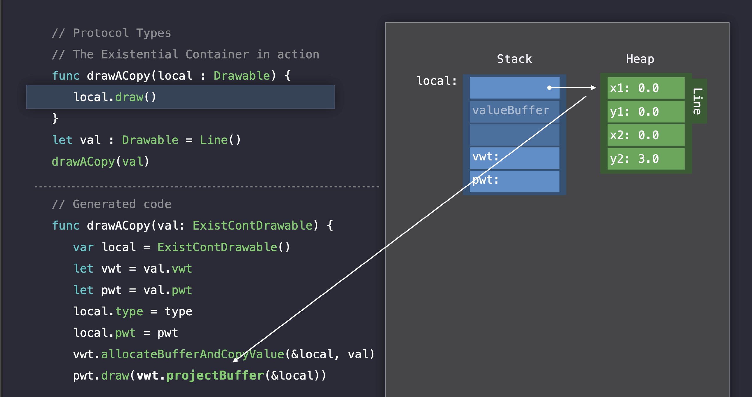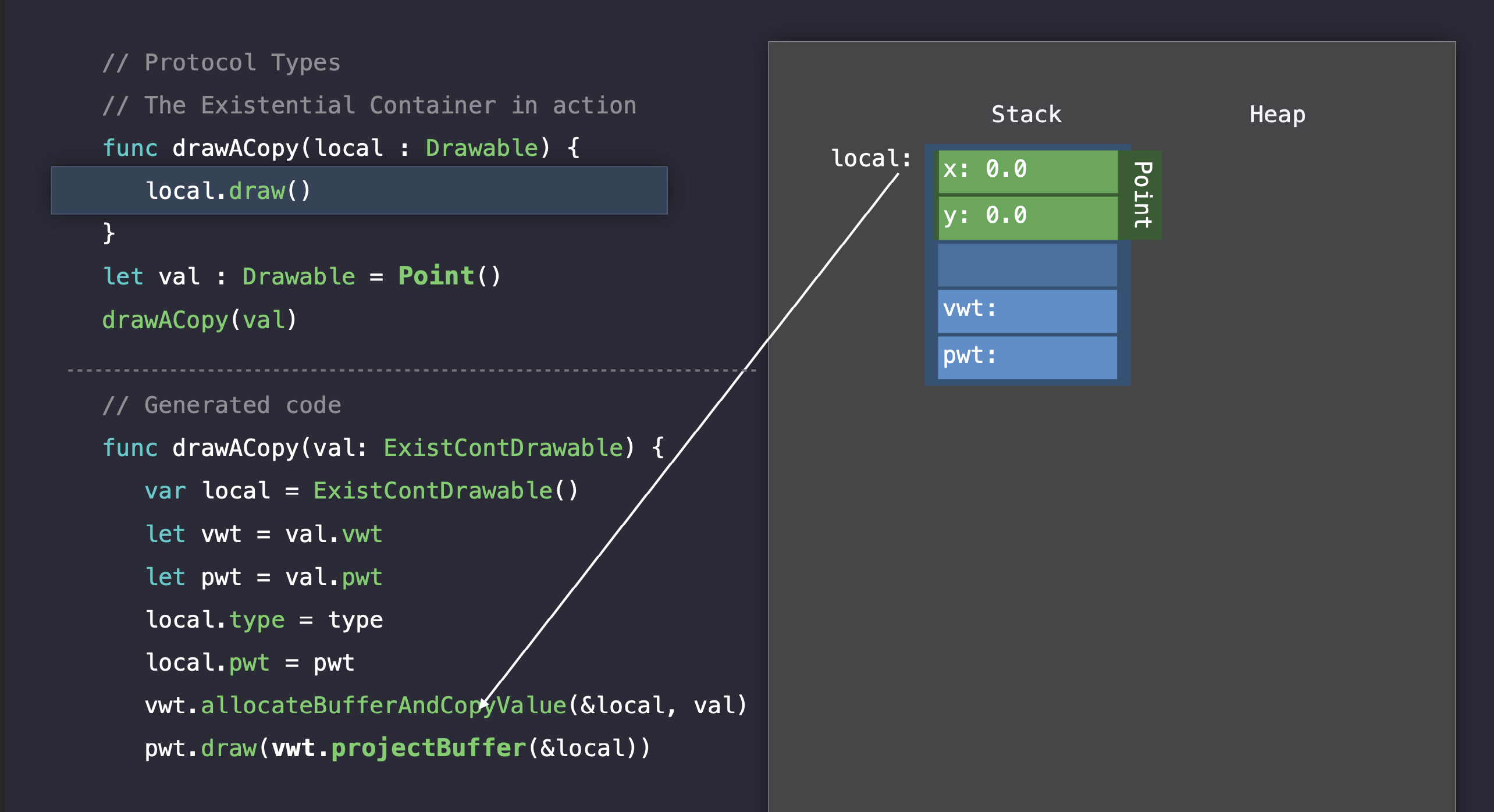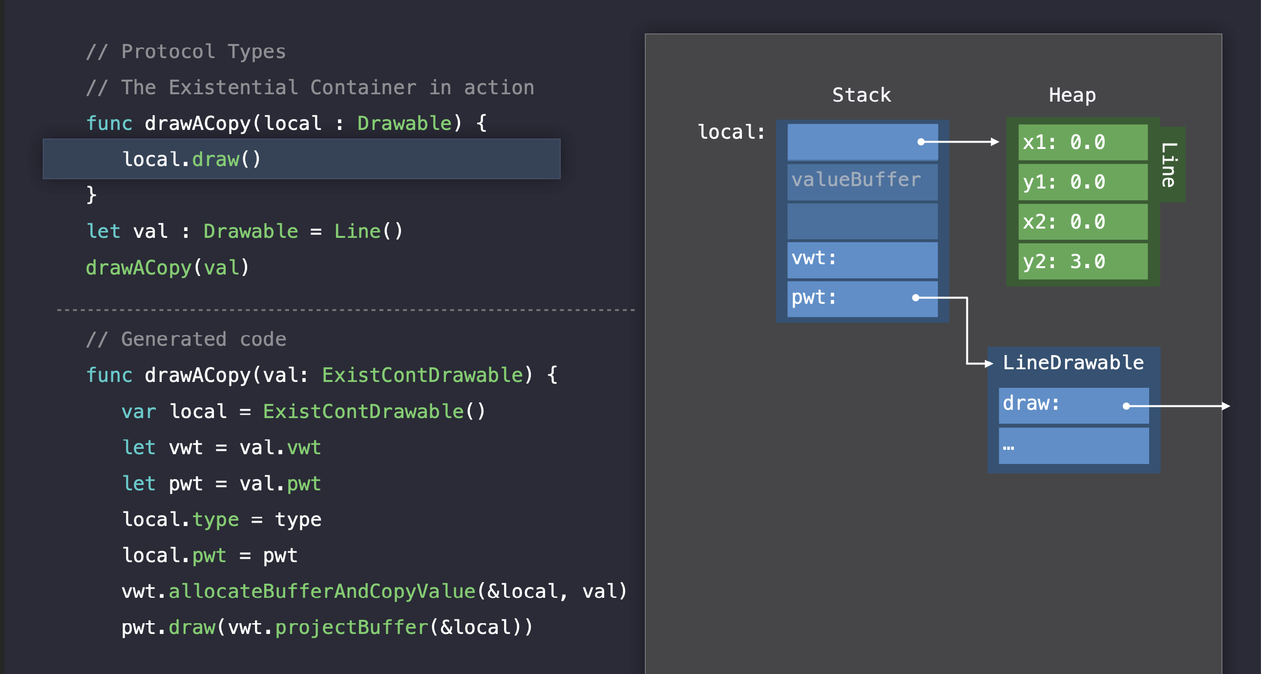 이제 local.draw 메서드가 실행되면, Swift는 existential container의 필드에서 PWT를 조회해서, 해당 테이브의 fixed offset에 있는 draw 메서드의 구현체로 jump 합니다.