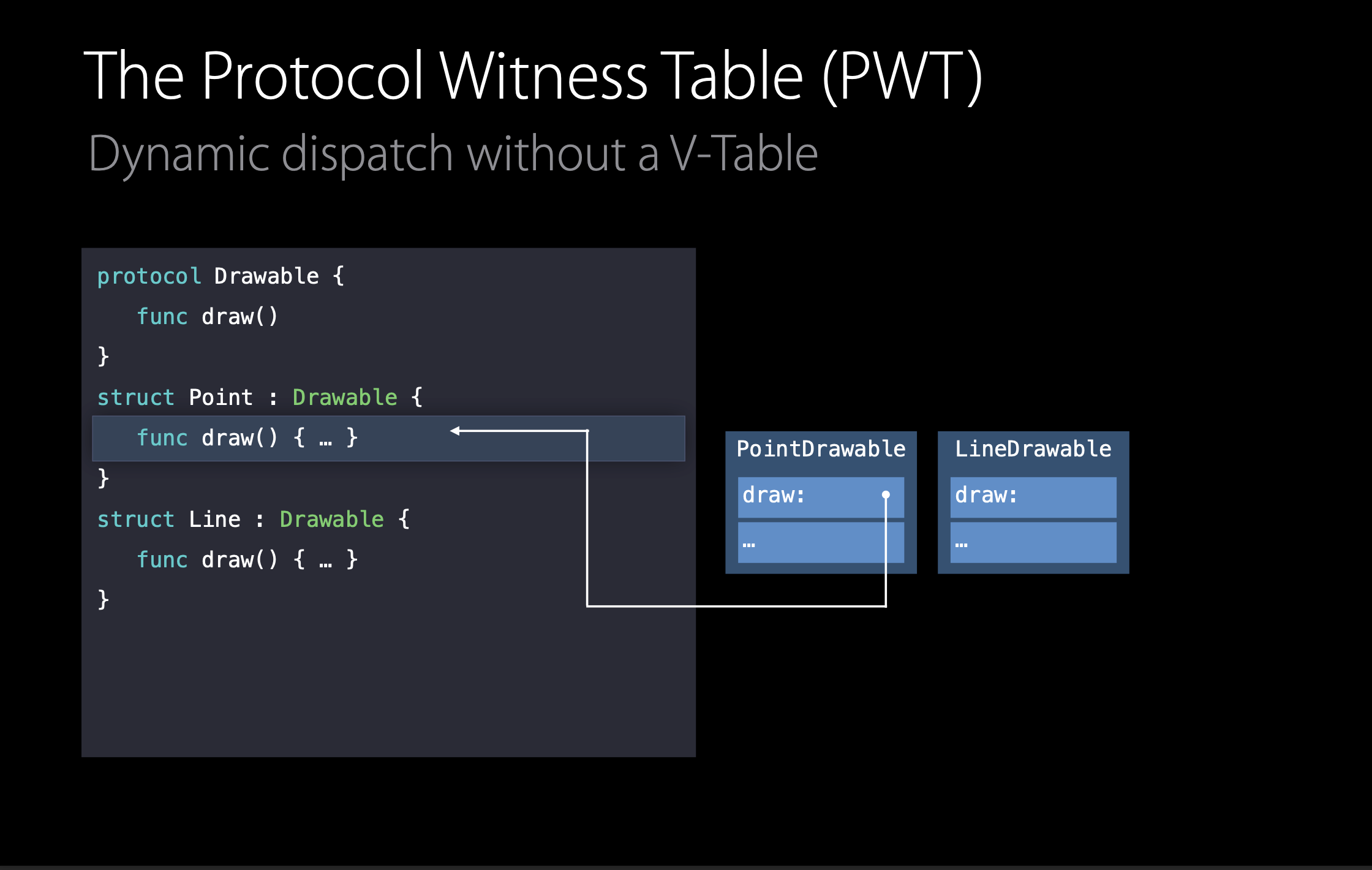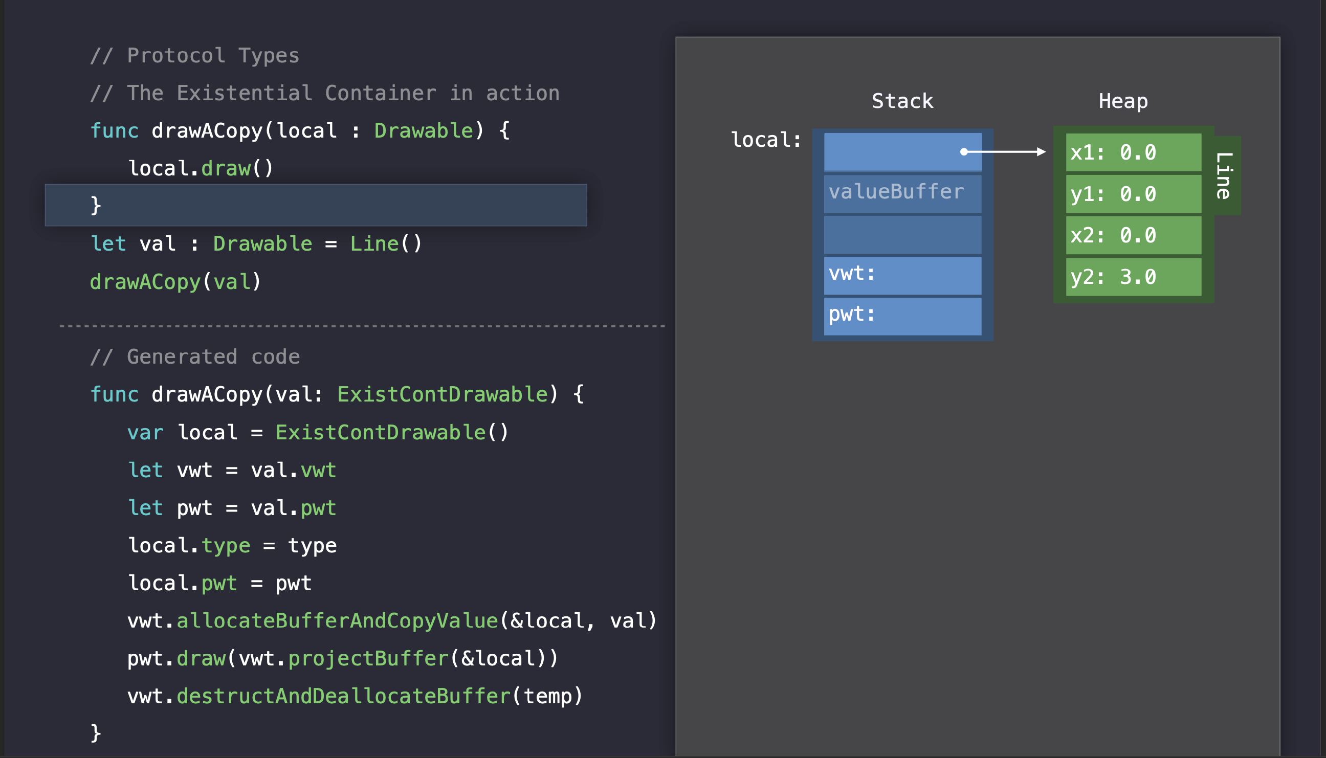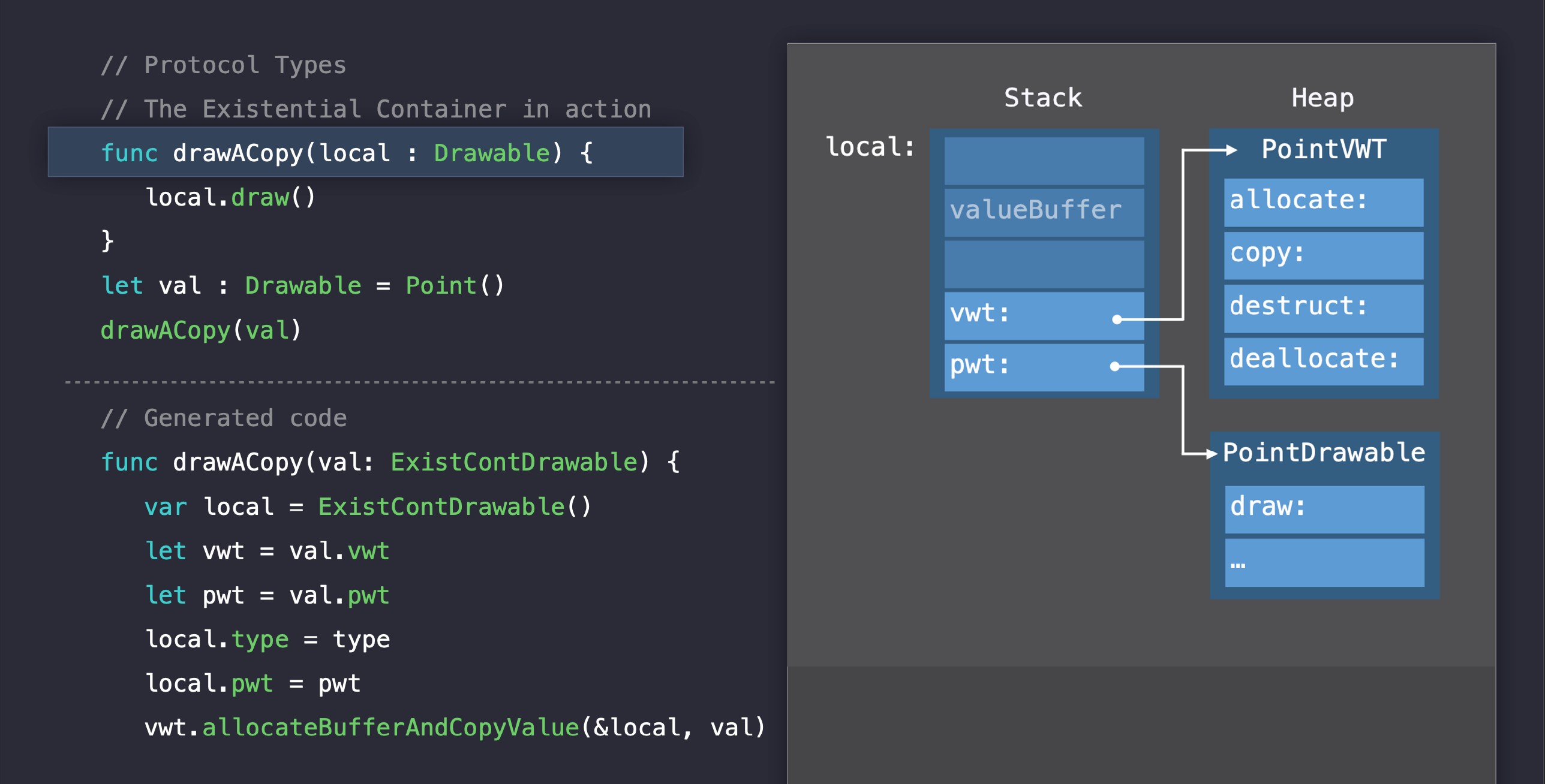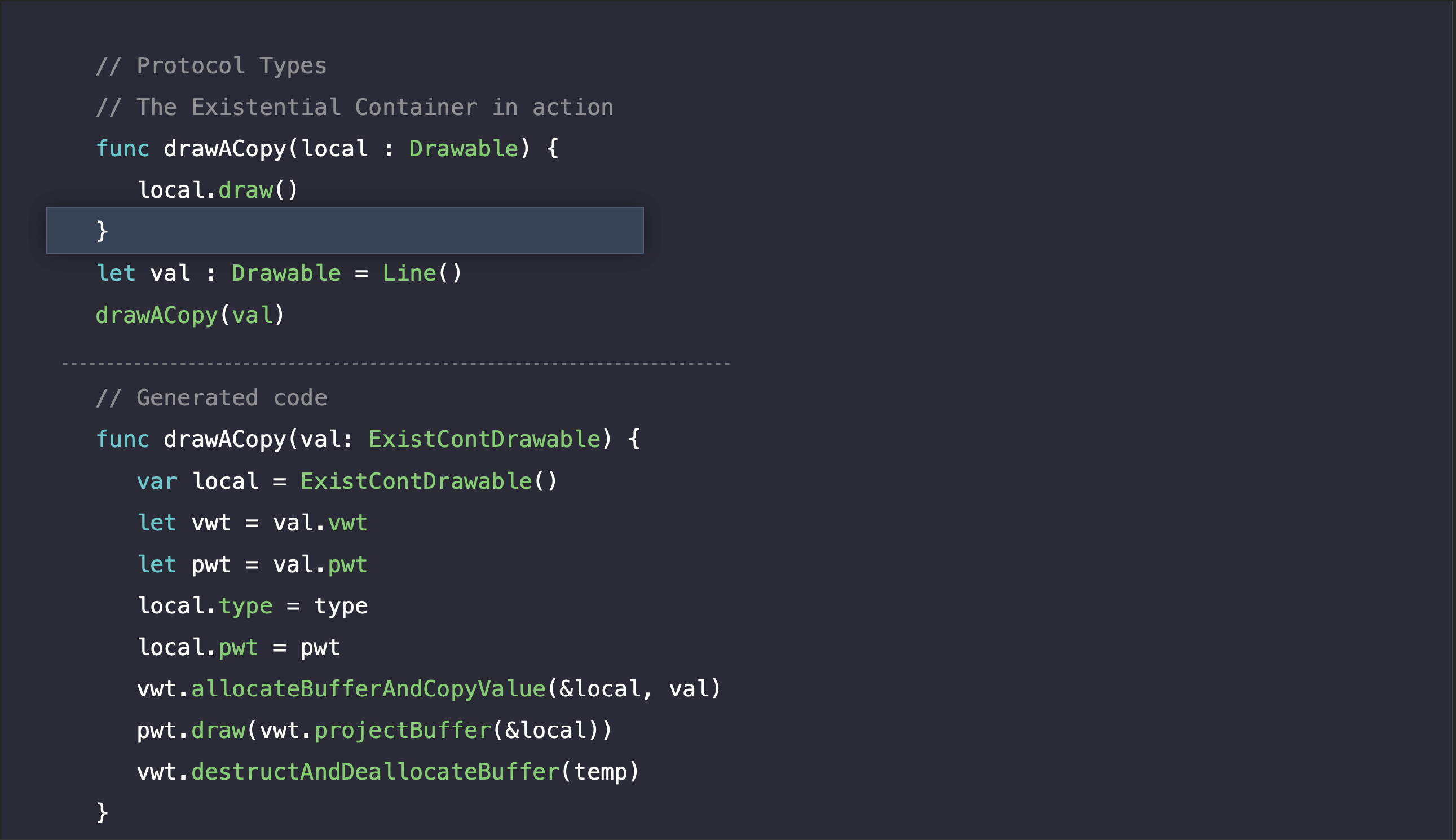 이제 local.draw 메서드가 실행되면, Swift는 existential container의 필드에서 PWT를 조회해서, 해당 테이브의 fixed offset에 있는 draw 메서드의 구현체로 jump 합니다.