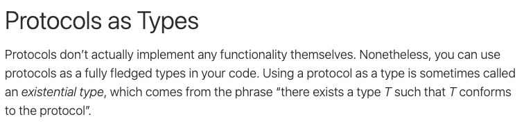 (또한, protocol을 type으로 사용할 때 existential type이라고 부릅니다. 뭔가 관련이 있다고 느껴집니다.)