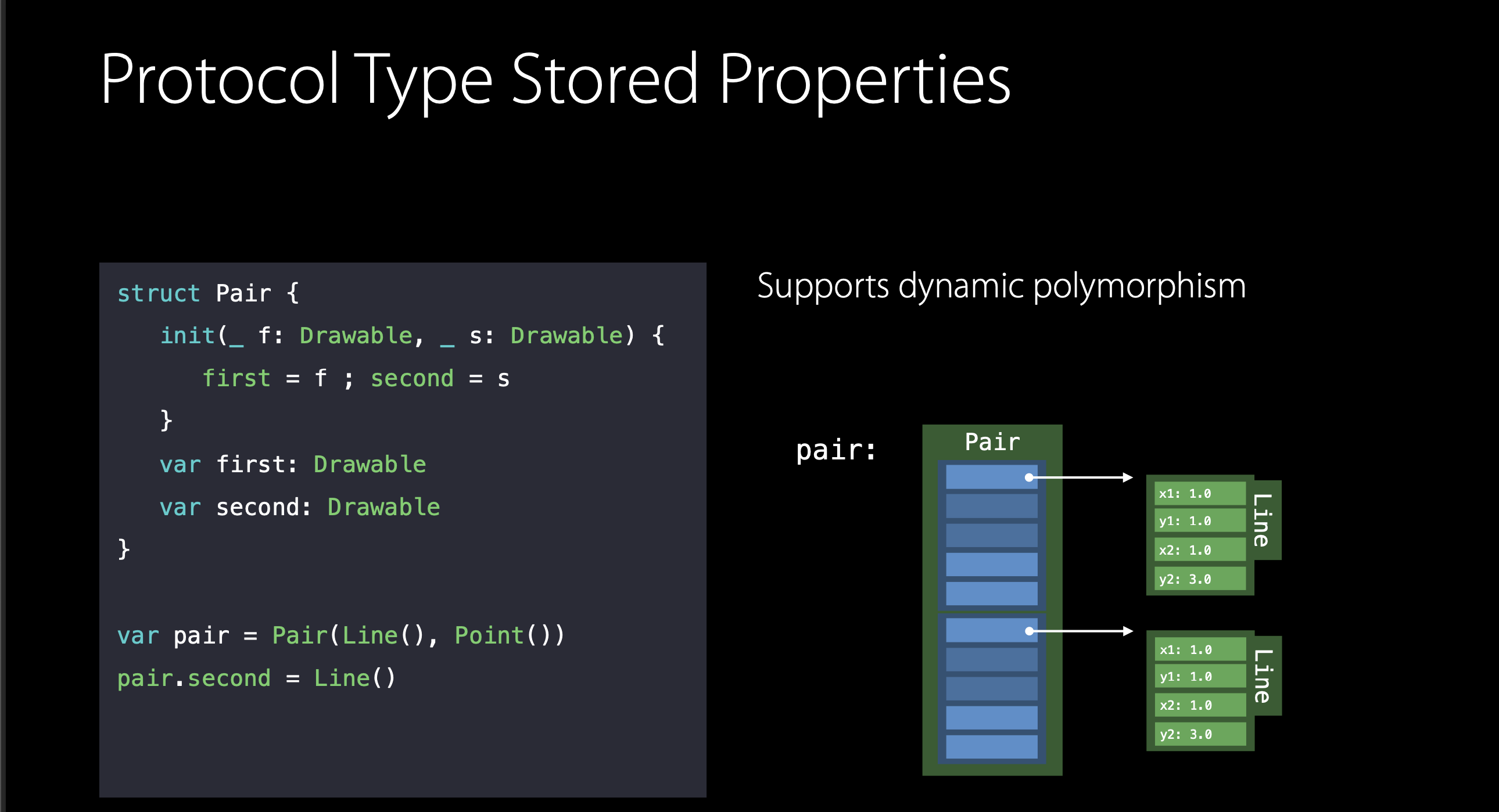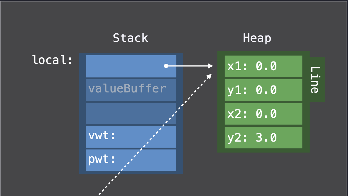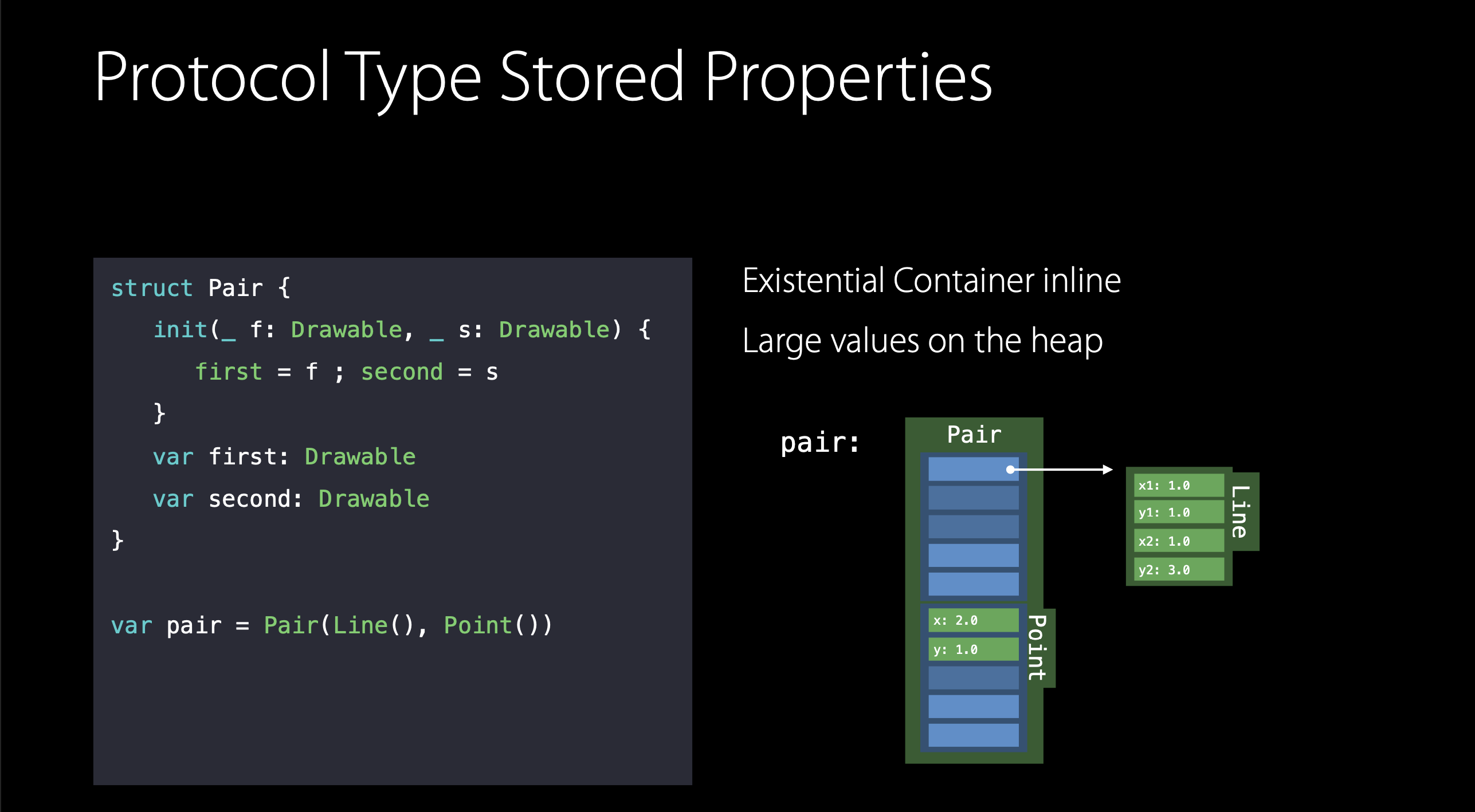 Line과 Point에는 이렇게 차이 생기는데, existential container은 어떤 방식으로 이 차이를 관리할까요? (이 차이로 인해서 뭐가 달라지는지 정확히 알 수 없지만, 뒤의 내용을 보아 lifetime관리에서 차이가 있는 것으로 보입니다. stack과 heap에서의 데이터 관리 방법이 다르기 때문이죠)