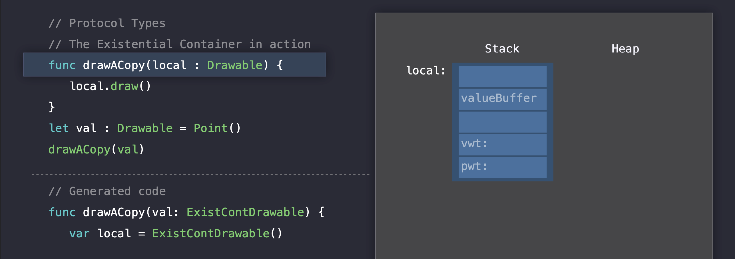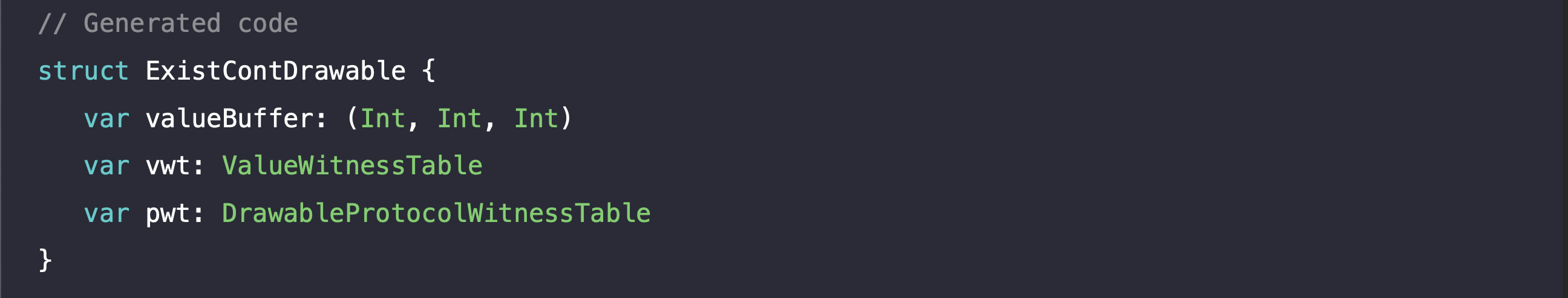 원래는 swift 코드가 아니지만, 예제에서 pseudocode로 쉽게 표현해주었습니다. 위에서 공부했다시피 5 word의 Existential Container에는 3 word의 valueBuffer, VWT의 레퍼런스, PWT의 레퍼런스가 존재합니다.