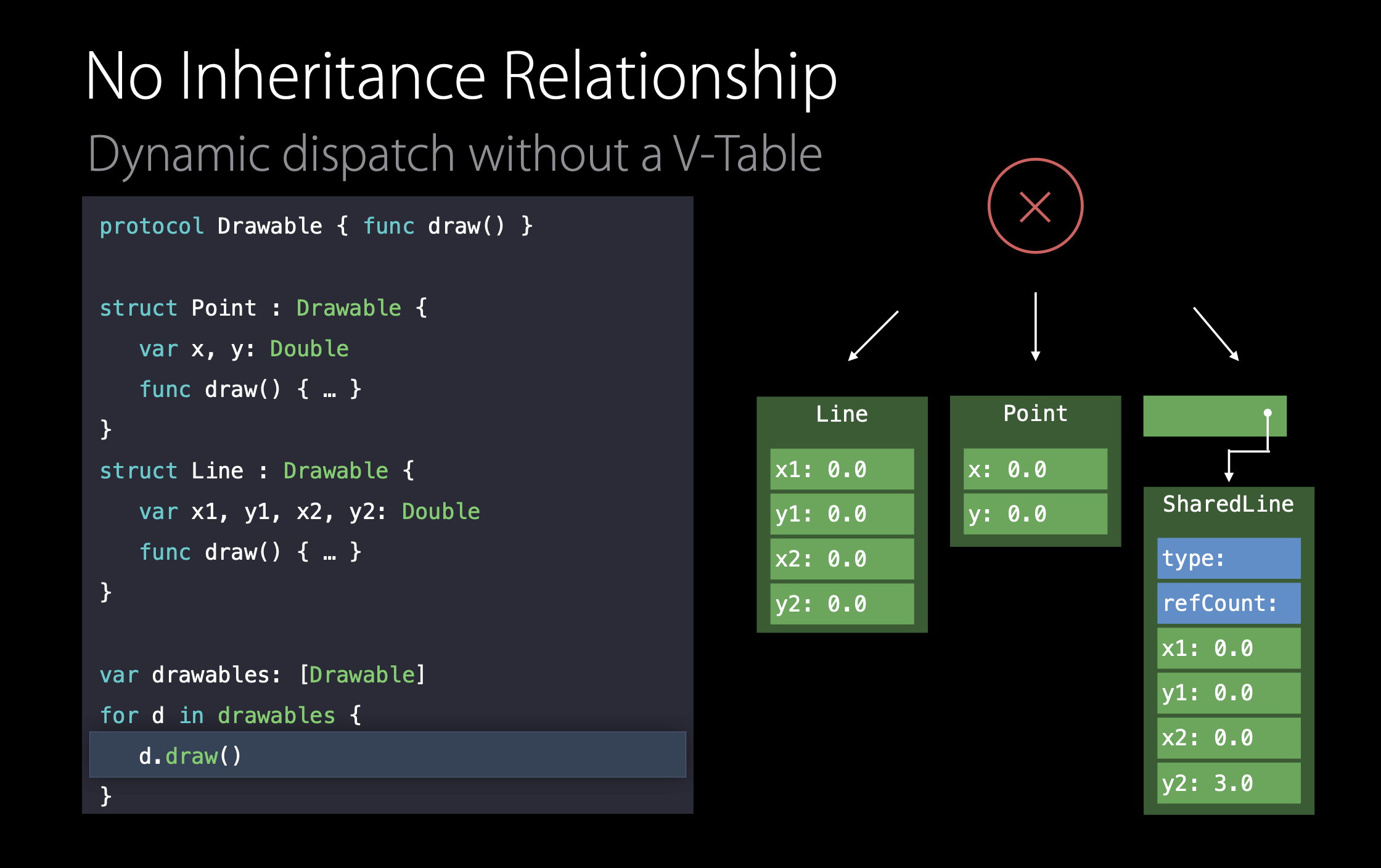 각 struct는 protocol을 채택하여 구현했고, 때문에 상속관계가 없어 v-table이 존재하지 않습니다. (SharedLine은 무시해도 됩니다)