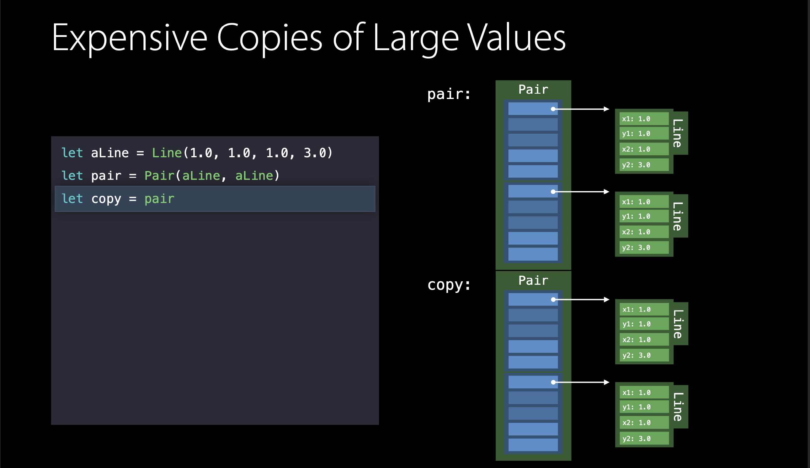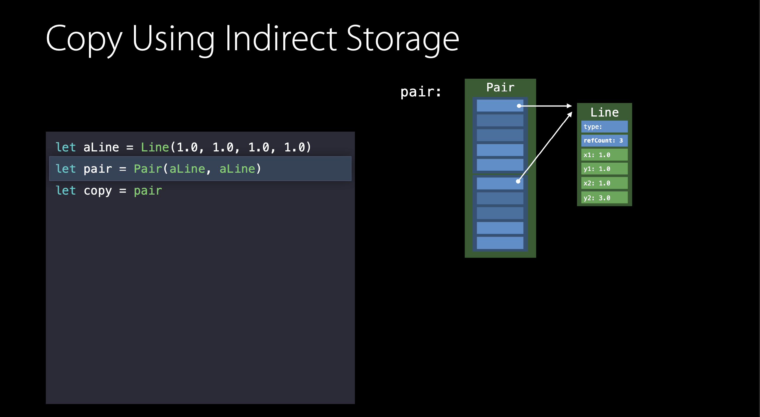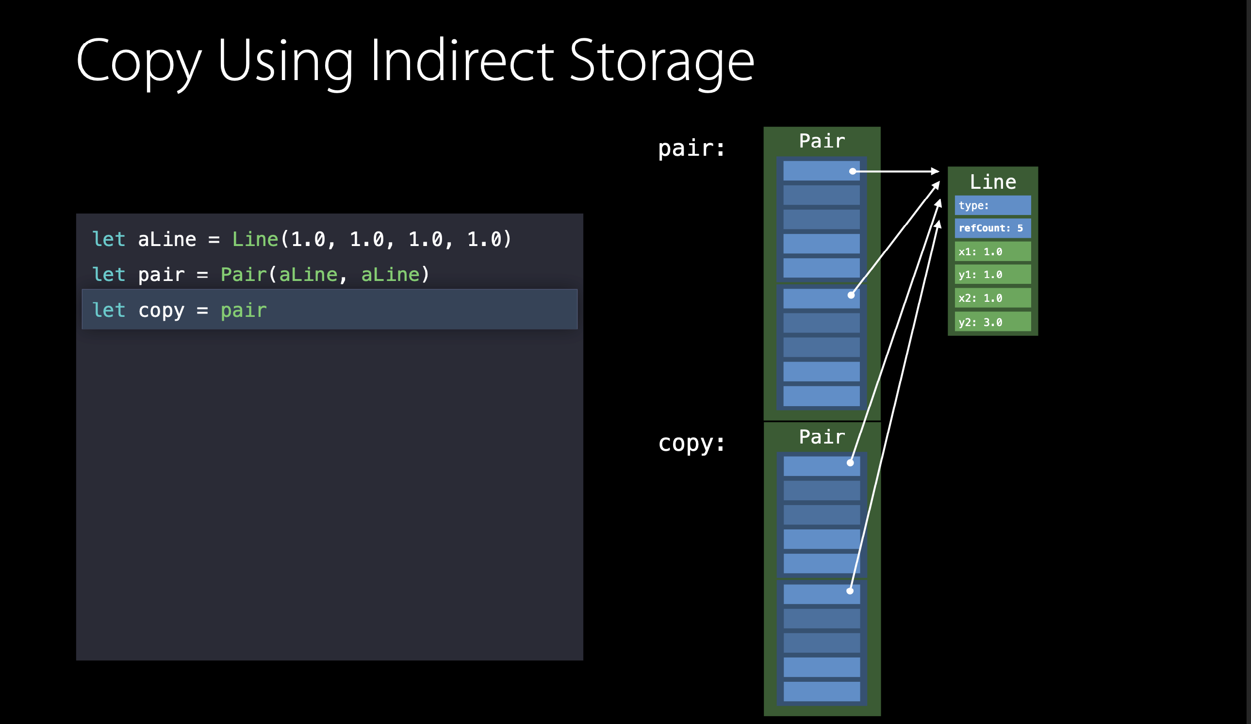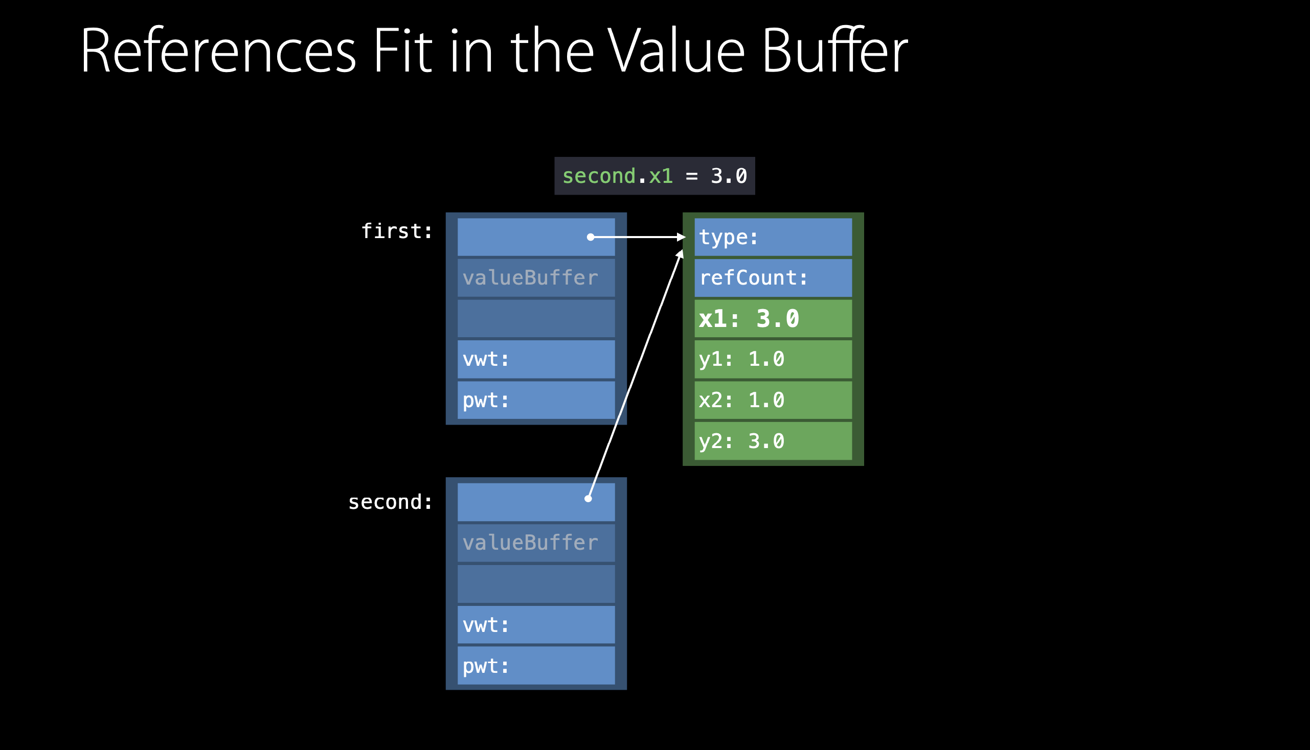 쉬운 이해를 위해 두 가지 프레젠테이션을 합쳤습니다. VWT(Value Witness Table)에서 (필요하다면) allocate 함수와 copy 함수를 호출합니다. (아래 그림을 보면, Point의 경우에는 heap allocate가 필요하지 않으므로 필요하다면이라는 조건이 붙은 것 같습니다.)
