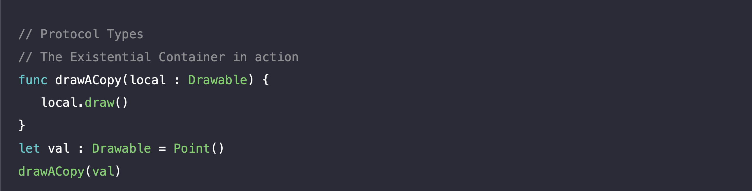 * 프로토콜 변수가 사용될 때에는 내부적으로 변수 자체를 주고받는 것이 아니라 existential container를 주고받습니다.
