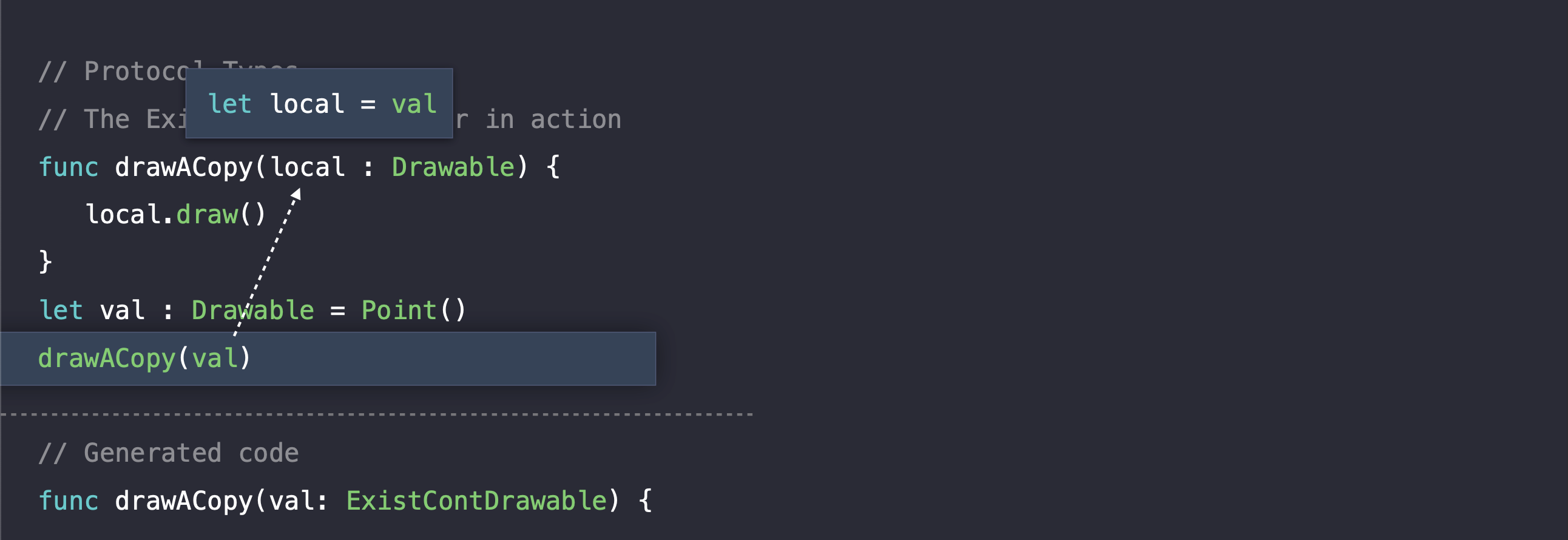 컴파일된 코드를 보면 함수의 매개변수로 existential container를 전달하는 것을 볼 수 있습니다.