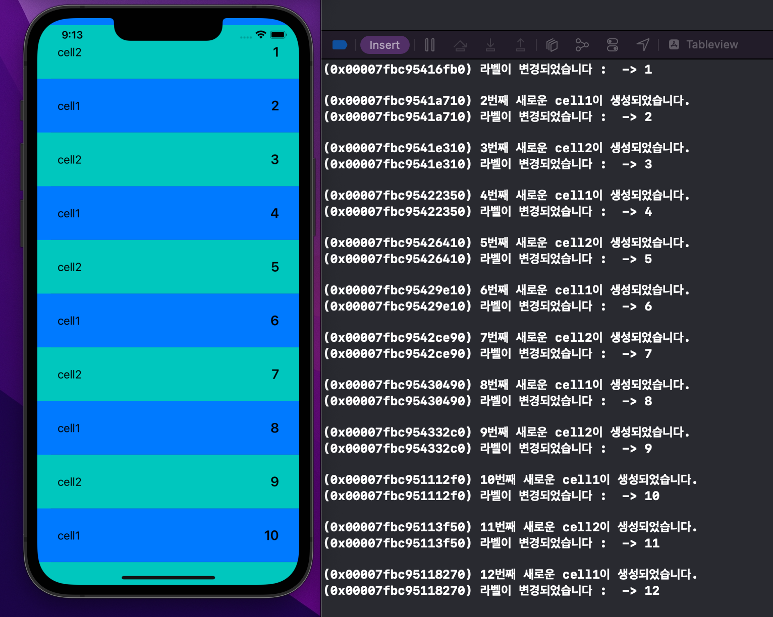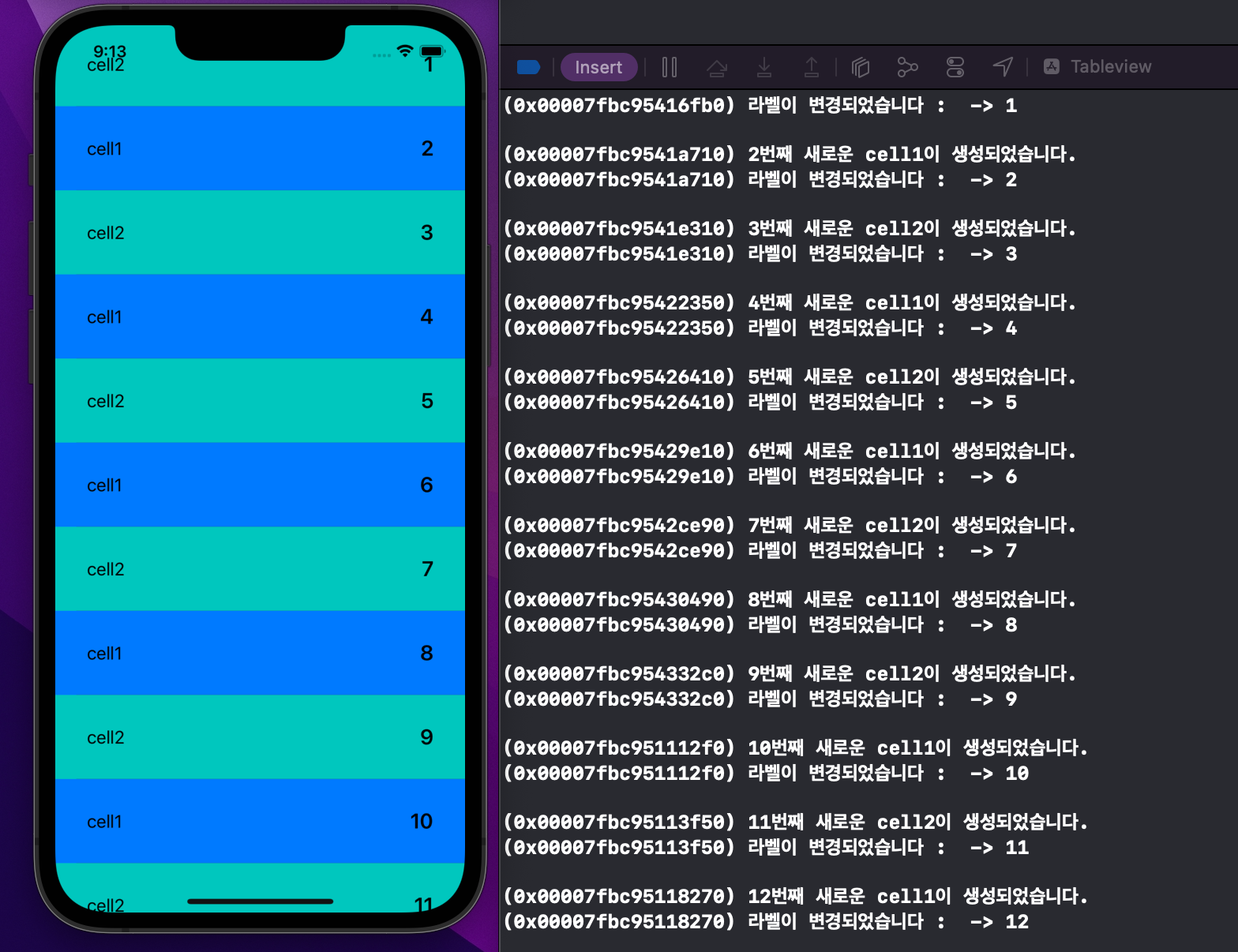 즉 tableviewcell이 어떤 방식으로 재활용되는지 알아보는 간접적인 실험입니다.